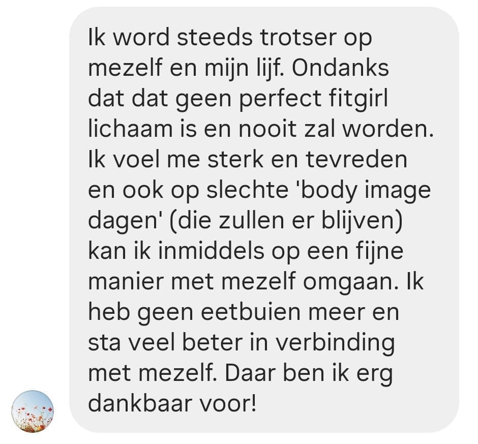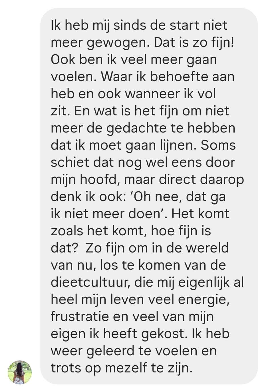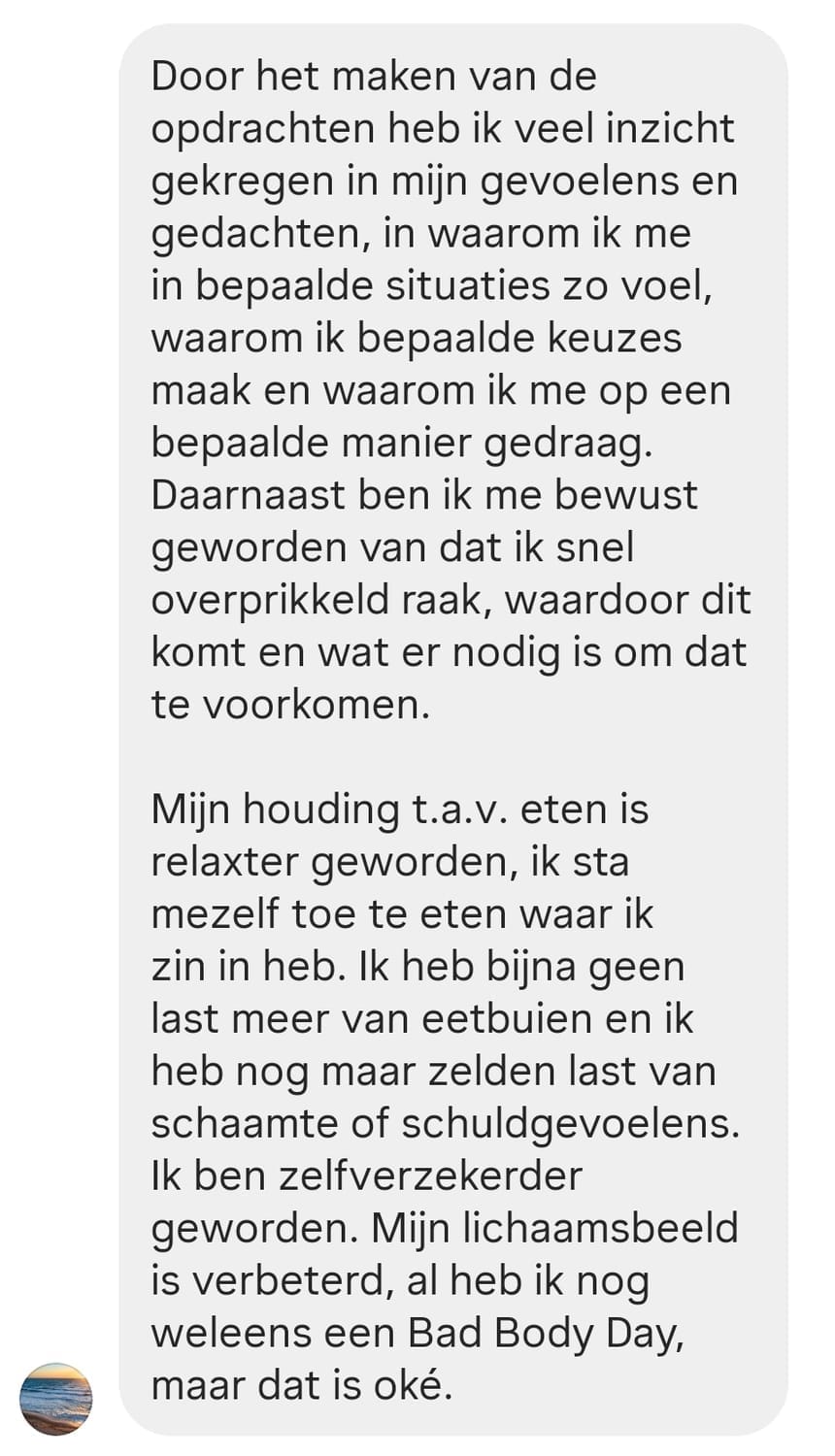 Door te werken aan een gezonde relatie met eten, je lichaam en jezelf en meer zelfacceptatie, kun je je ook gelukkiger, zelfverzekerder en meer ontspannen voelen, zonder dat je lichaam hiervoor hoeft te veranderen. Keer op keer hoor ik dat terug van mijn cliënten die het traject "Op weg naar een gezonde relatie met eten, je lichaam en jezelf" hebben gevolgd.