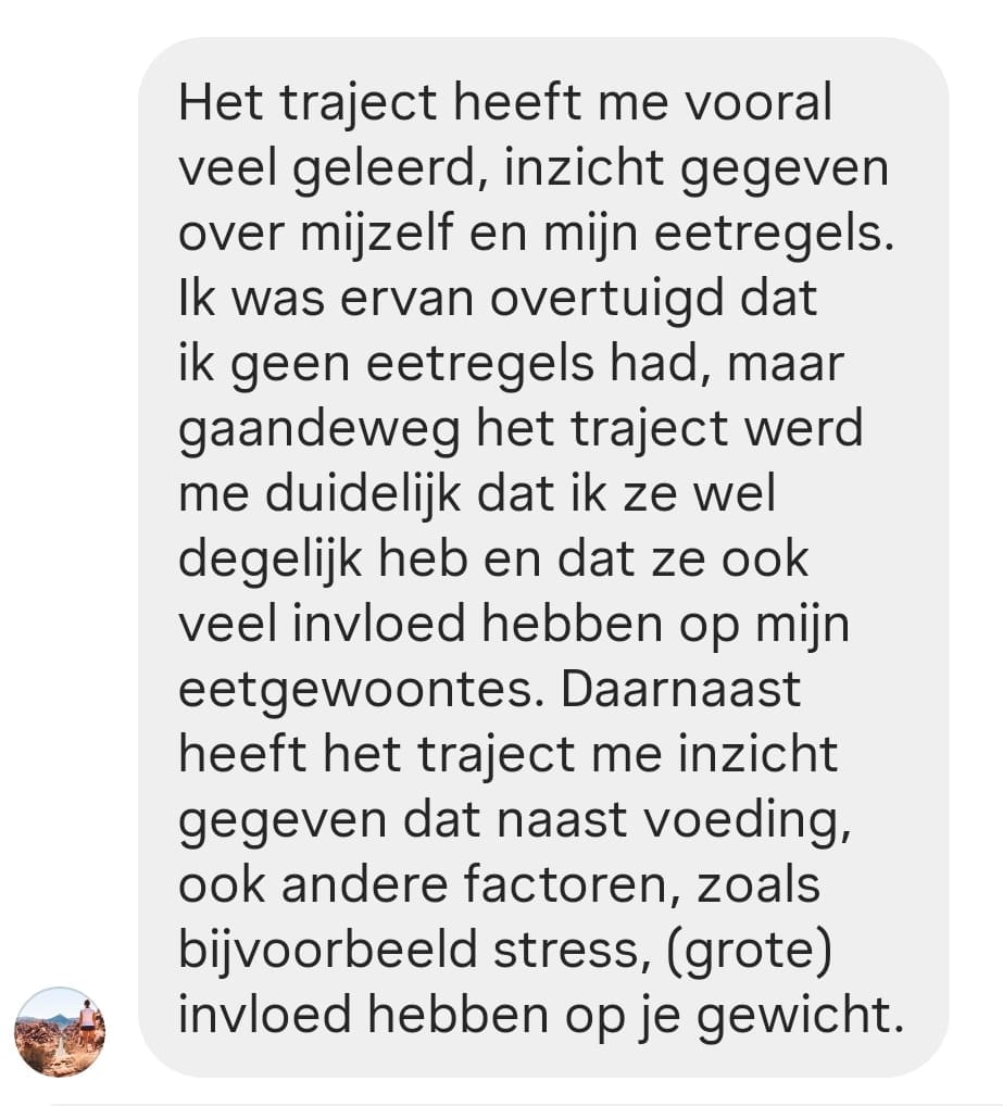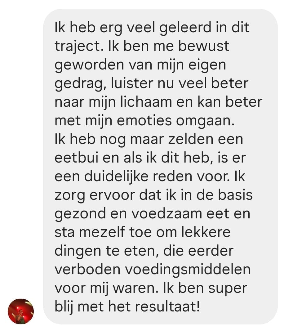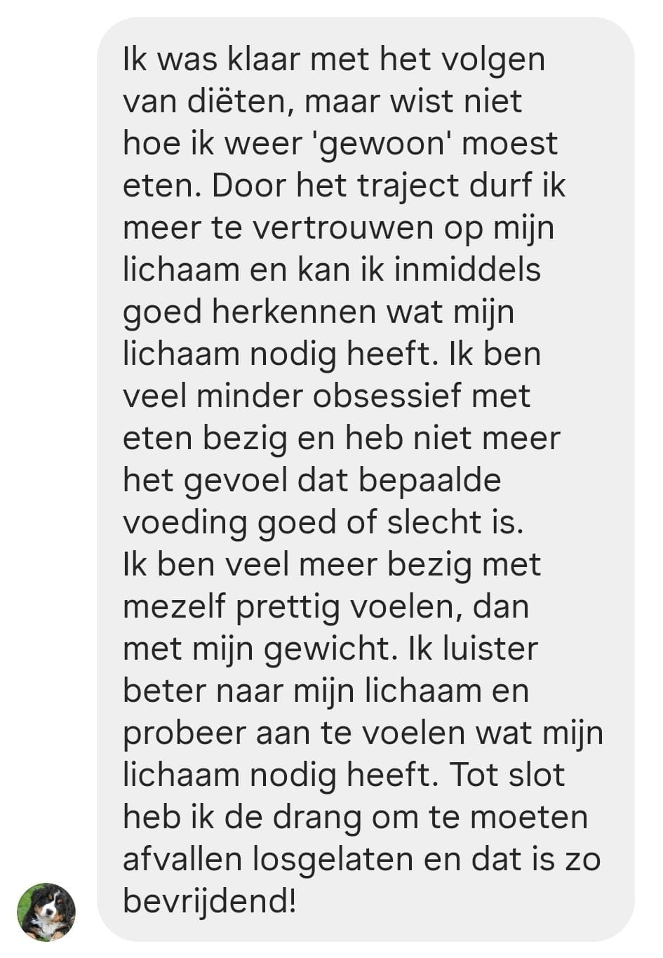 Door te werken aan een gezonde relatie met eten, je lichaam en jezelf en meer zelfacceptatie, kun je je ook gelukkiger, zelfverzekerder en meer ontspannen voelen, zonder dat je lichaam hiervoor hoeft te veranderen. Keer op keer hoor ik dat terug van mijn cliënten die het traject "Op weg naar een gezonde relatie met eten, je lichaam en jezelf" hebben gevolgd.