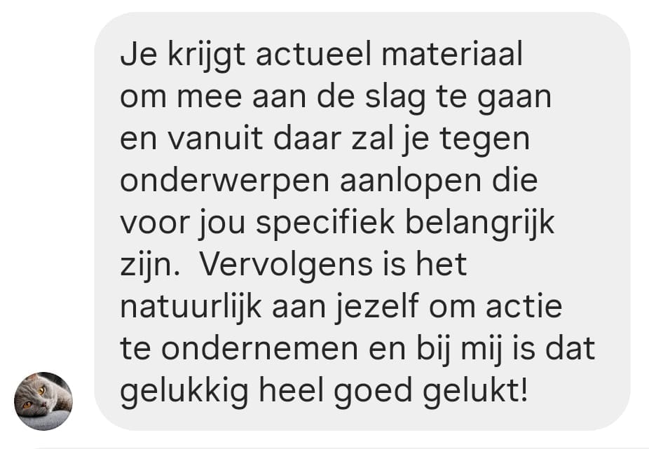 Tot slot is het traject niet geschikt voor mensen die niet willen investeren in zelfzorg en hun mentale & lichamelijke gezondheid.